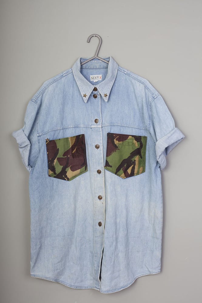 unisex over-sized, unique customized denim shirt with large camouflage printed pocket/s and studded detailing on the collar.